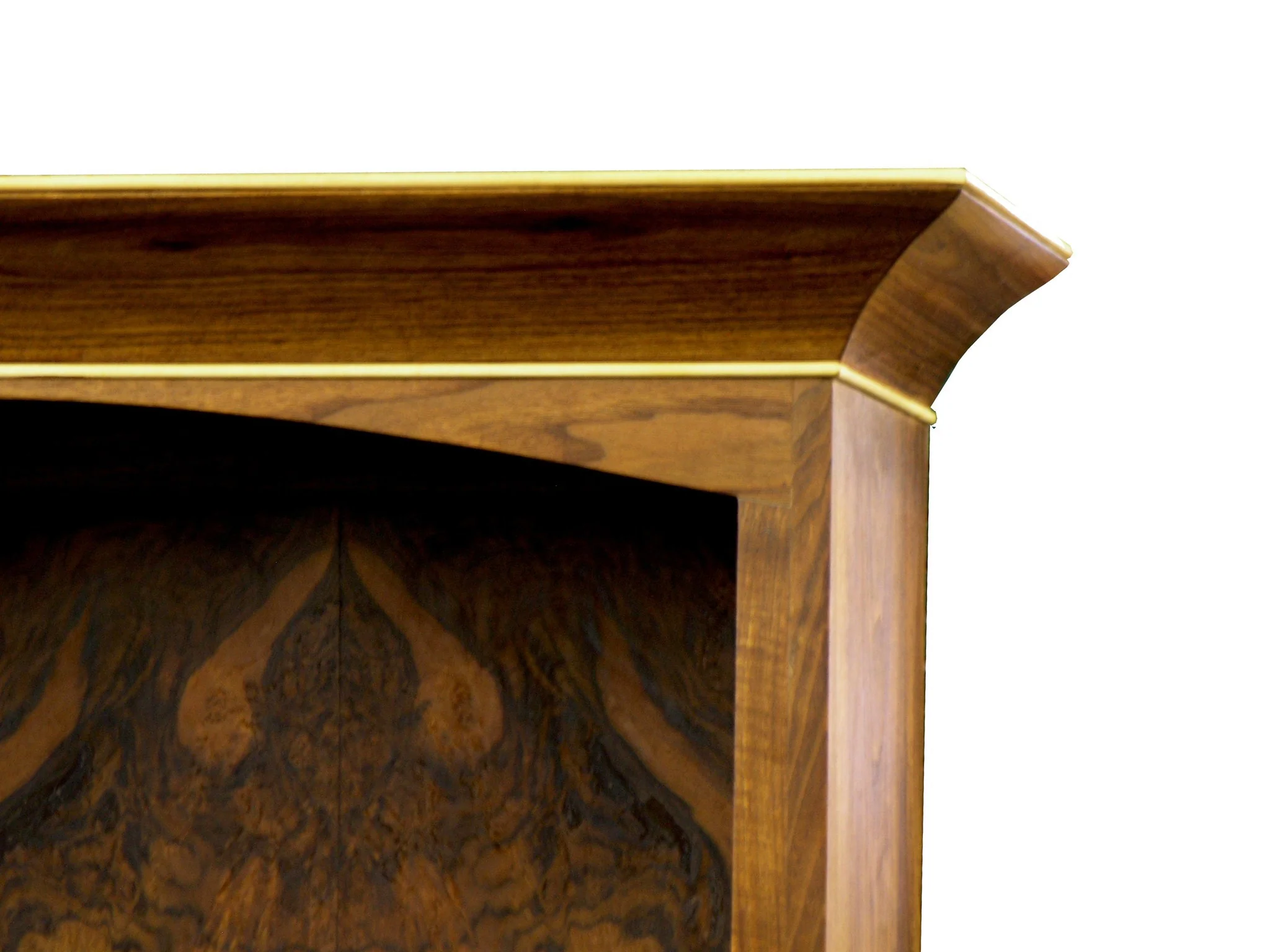 The back face of the bookcase has a book matched veneer pattern made of unique walnut burl that has awesome bark and sapwood inclusions that help add to the contrast of this piece while tying into the maple accents seamlessly.