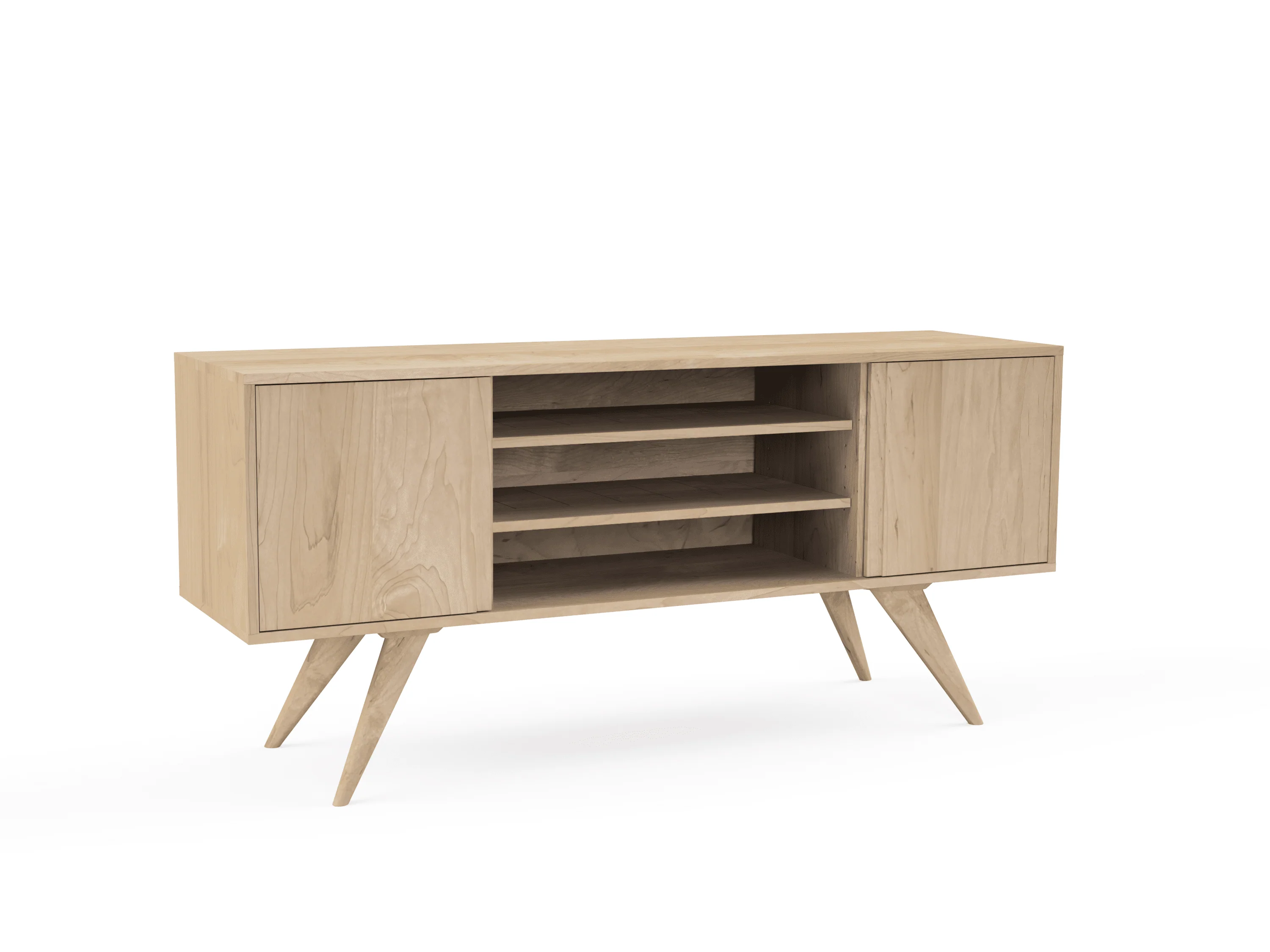 The Modern Entertainment Console is a handcrafted piece made from natural solid wood. It has clean lines and a modern style, making it suitable for any living space, whether it has a traditional or contemporary design.