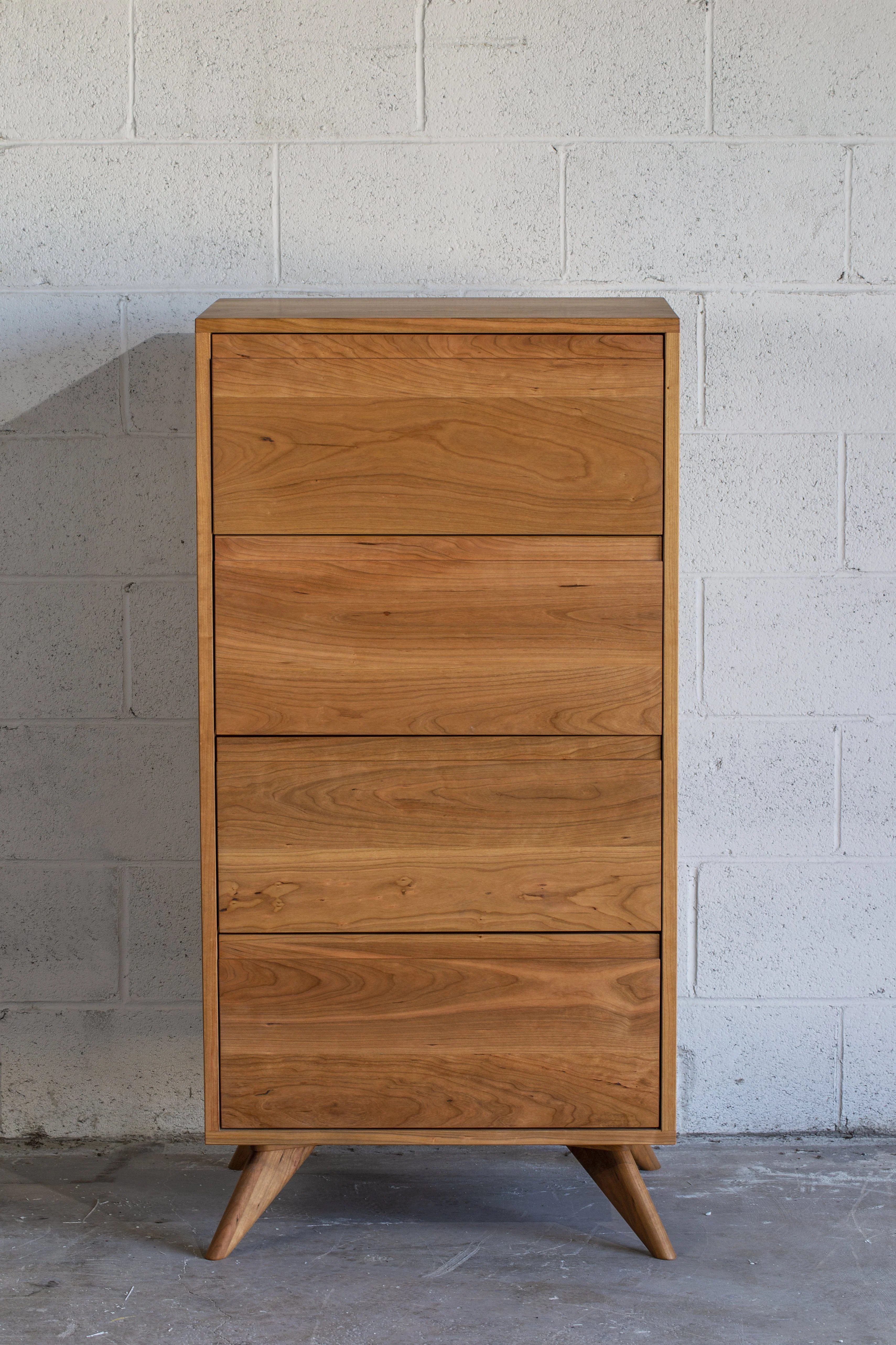 Transform your bedroom with the Tall Modern Dresser in solid cherry wood. Featuring mid-century modern design with clean lines and signature tapered legs, this dresser is handcrafted by local artisans using premium hardwood and traditional joinery techniques. The warm, natural tones of cherry wood complement the sleek silhouette, creating a versatile storage solution that works beautifully in contemporary or traditional interiors.